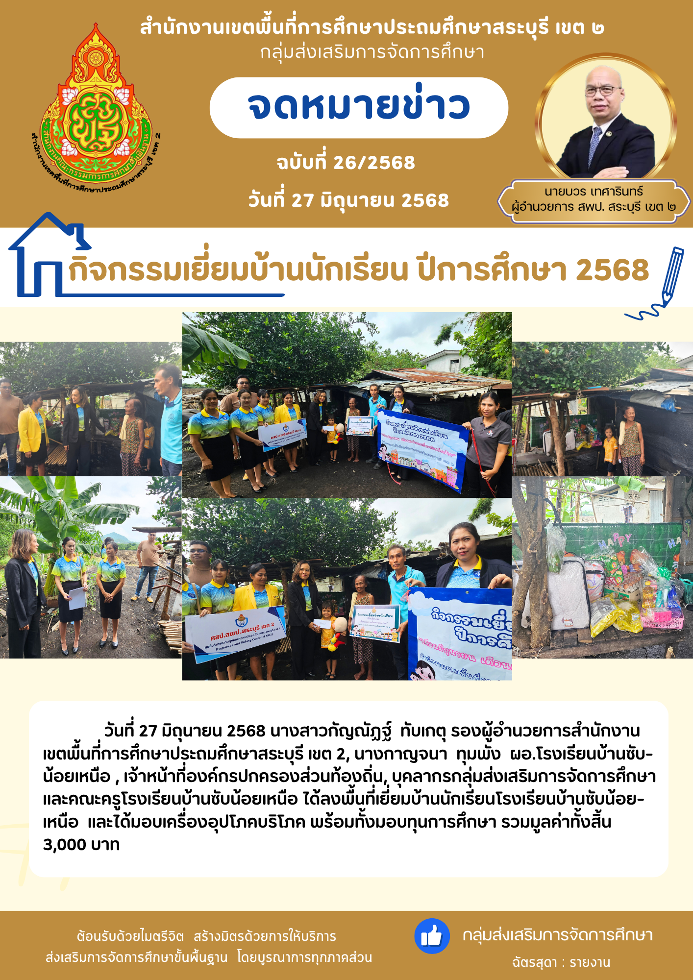 วันที่ ๒๗ มิถุนายน ๒๕๖๘ ดร.บวร เทศารินทร์ ผู้อำนวยการ สพป.สระบุรี เขต ๒ มอบหมายให้ นางสาวกัญณัฏฐ์ ทับเกตุ รองผู้อำนวยการ สพป.สระบุรี เขต ๒ ,นางกาญจนา ทุมพัง ผู้อำนวยการโรงเรียนบ้านซับน้อยเหนือ, เจ้าหน้าที่องค์กรปกครองส่วนท้องถิ่น, บุคลากรกลุ่มส่งเสริมการจัดการศึกษา, คณะครูโรงเรียนบ้านซับน้อยเหนือลงพื้นที่เยี่ยมบ้านนักเรียนโรงเรียนบ้านซับน้อยเหนือ และได้มอบเครื่องอุปโภค บริโภค พร้อมทั้งมอบทุนการศึกษา รวมมูลค่าทั้งสิ้น ๓,๐๐๐ บาท