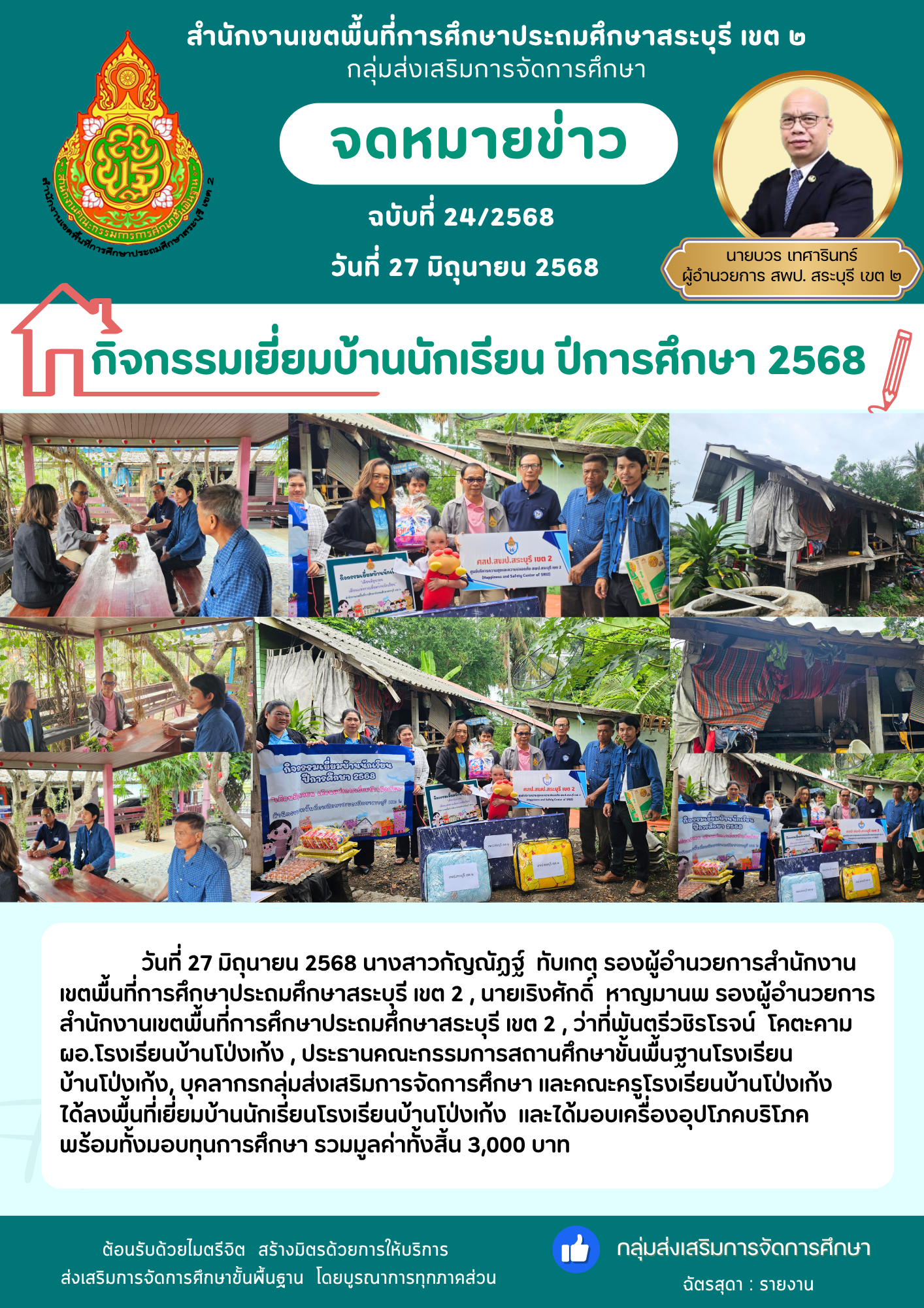 วันที่ ๒๖ มิถุนายน ๒๕๖๘ ดร.บวร เทศารินทร์ ผู้อำนวยการ สพป.สระบุรี เขต ๒ มอบหมายให้ นางสาวกัญณัฏฐ์ ทับเกตุ และ นายเริงศักดิ์ หาญมานพ รองผู้อำนวยการ สพป.สระบุรี เขต ๒ ,ว่าที่พันตรีวชิรโรจน์ โคตะคาม ผู้อำนวยการโรงเรียนบ้านโป่งเก้ง,ประธานคณะกรรมการการศึกษาขั้นพื้นฐานโรงเรียนบ้านโป่งเก้ง บุคลากรกลุ่มส่งเสริมการจัดการศึกษา, คณะครูโรงเรียนบ้านโป่งเก้ง ลงพื้นที่เยี่ยมบ้านนักเรียนโรงเรียนบ้านโป่งเก้ง และได้มอบเครื่องอุปโภค บริโภค พร้อมทั้งมอบทุนการศึกษา รวมมูลค่าทั้งสิ้น ๓,๐๐๐ บาท