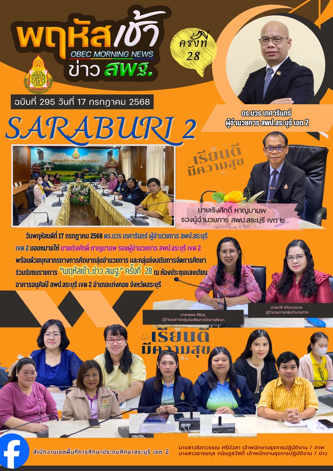 วันที่ ๑๗ กรกฎาคม ๒๕๖๘ ดร.บวร เทศารินทร์ ผู้อำนวยการ สพป.สระบุรี เขต ๒ มอบหมายให้ นายเริงศักดิ์ หาญมานพ รองผู้อำนวยการ สพป.สระบุรี เขต ๒ พร้อมด้วย นางมาลี แก้วแววนาม ผู้อำนวยการกลุ่มอำนวยการ, นางกชพร ศิรปรุ ผู้อำนวยการกลุ่มส่งเสริมการจัดการศึกษา และบุคลากรทางการศึกษาของกลุ่มอำนวยการและกลุ่มส่งเสริมการจัดการศึกษา ร่วมรับชมรายการ "พฤหัสเช้า..ข่าว สพฐ." ครั้งที่ ๒๘/๒๕๖๘ ณ ห้องประชุมแสงเทียน อาคารอนุศิลป์ สพป.สระบุรี เขต ๒ อำเภอแก่งคอย จังหวัดสระบุรี