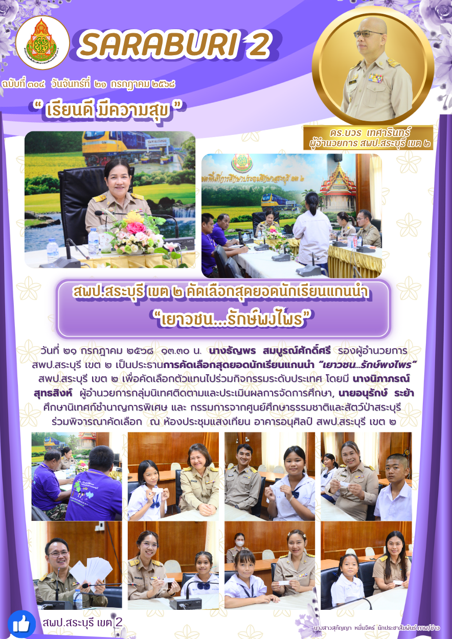 วันที่ ๒๑ กรกฎาคม ๒๕๖๘ ๑๓.๓๐ น. นางธัญพร สมบูรณ์ศักดิ์ศรี รองผู้อำนวยการ สพป.สระบุรี เขต ๒ เป็นประธานการคัดเลือกสุดยอดนักเรียนแกนนำ “เยาวชน...รักษ์พงไพร” สพป.สระบุรี เขต ๒ เพื่อคัดเลือกตัวแทนไปร่วมกิจกรรมระดับประเทศ โดยมี นางนิภาภรณ์ สุทธสิงห์ ผู้อำนวยการกลุ่มนิเทศติดตามและประเมินผลการจัดการศึกษา, นายอนุรักษ์ ระย้า ศึกษานิเทศก์ชำนาญการพิเศษ และ กรรมการจากศูนย์ศึกษาธรรมชาติและสัตว์ป่าสระบุรี ร่วมพิจารณาคัดเลือก ณ ห้องประชุมแสงเทียน อาคารอนุศิลป์ สพป.สระบุรี เขต ๒ อำเภอแก่งคอย จังหวัดสระบุรี