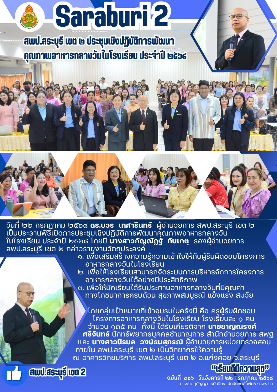วันที่ ๒๒ กรกฎาคม ๒๕๖๘ ดร.บวร เทศารินทร์ ผู้อำนวยการ สพป.สระบุรี เขต ๒ เป็นประธานพิธีเปิดการประชุมเชิงปฏิบัติการพัฒนาคุณภาพอาหารกลางวันในโรงเรียน ประจำปี ๒๕๖๘ โดยมี นางสาวกัญณัฏฐ์ ทับเกตุ รองผู้อำนวยการ สพป.สระบุรี เขต ๒ กล่าวรายงานวัตถุประสงค์ ๑. เพื่อเสริมสร้างความรู้ความเข้าใจให้กับผู้รับผิดชอบโครงการอาหารกลางวันในโรงเรียน