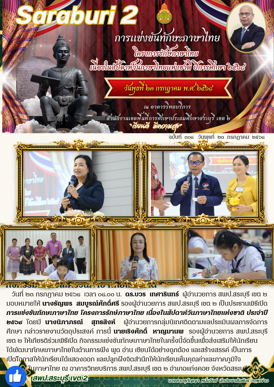 วันที่ ๒๓ กรกฎาคม ๒๕๖๘ เวลา ๐๘.๐๐ น. ดร.บวร เทศารินทร์ ผู้อำนวยการ สพป.สระบุรี เขต ๒ มอบหมายให้ นางธัญพร สมบูรณ์ศักดิ์ศรี รองผู้อำนวยการ สพป.สระบุรี เขต ๒ เป็นประธานพิธีเปิดการแข่งขันทักษะภาษาไทย โครงการรักษ์ภาษาไทย เนื่องในสัปดาห์วันภาษาไทยแห่งชาติ ประจำปี ๒๕๖๘ โดยมี นางนิภาภรณ์ สุทธสิงห์ ผู้อำนวยการกลุ่มนิเทศติดตามแลประเมินผลการจัดการศึกษา กล่าวรายงานวัตถุประสงค์ การนี้ นายเริงศักดิ์ หาญมานพ รองผู้อำนวยการ สพป.สระบุรีเขต ๒ ให้เกียรติร่วมพิธีเปิด กิจกรรมแข่งขันทักษะภาษาไทยในครั้งนี้จัดขึ้นเพื่อส่งเสริมให้นักเรียนได้พัฒนาทักษะภาษาไทยในด้านการฟัง พูด อ่าน เขียนได้อย่างถูกต้อง และสร้างสรรค์ เป็นการเปิดโิอกาสให้นักเรียนได้แสดงออก และปลูกฝังจิตสำนึกให้นักเรียนเห็นคุณค่าและภาคภูมิใจในภาษาไทย ณ อาคารวิทยบริการ สพป.สระบุรี เขต ๒ อำเภอแก่งคอย จังหวัดสระบุรี