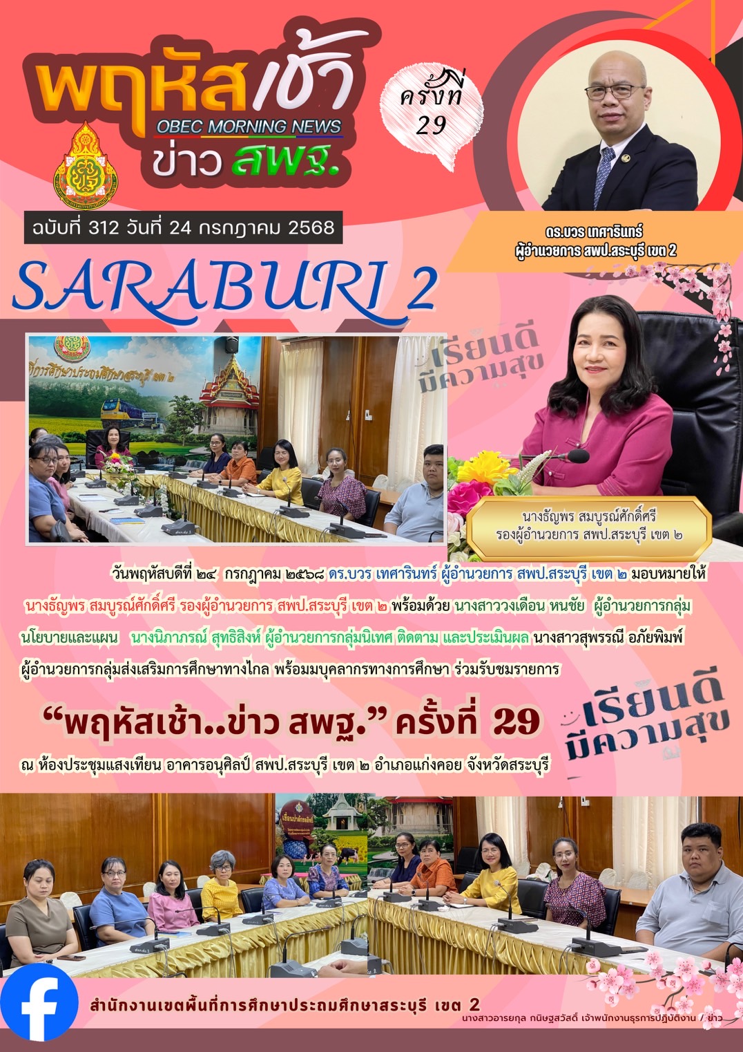 วันที่ ๒๓ กรกฎาคม ๒๕๖๘ ดร.บวร เทศารินทร์ ผู้อำนวยการ สพป.สระบุรี เขต ๒ มอบหมายให้ นางธัญพร สมบูรณ์ศักดิ์ศรี รองผู้อำนวยการ สพป.สระบุรี เขต ๒ พร้อมด้วย นางนิภาภรณ์ สุทธสิงห์ ผู้อำนวยการกลุ่มอำนวยการ, นางกชพร ศิรปรุ ผู้อำนวยการกลุ่มส่งเสริมการจัดการศึกษา และบุคลากรทางการศึกษาของกลุ่มอำนวยการและกลุ่มส่งเสริมการจัดการศึกษา ร่วมรับชมรายการ "พฤหัสเช้า..ข่าว สพฐ." ครั้งที่ ๒๘/๒๕๖๘ ณ ห้องประชุมแสงเทียน อาคารอนุศิลป์ สพป.สระบุรี เขต ๒ อำเภอแก่งคอย จังหวัดสระบุรี