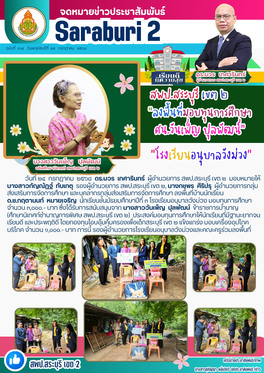 วันที่ ๒๔ กรกฎาคม ๒๕๖๘ ดร.บวร เทศารินทร์ ผู้อำนวยการ สพป.สระบุรี เขต ๒ มอบหมายให้ นางสาวกัญณัฏฐ์ ทับเกตุ รองผู้อำนวยการ สพป.สระบุรี เขต ๒, นางกชพร ศิริปรุ ผู้อำนวยการกลุ่มส่งเสริมการจัดการศึกษา และบุคลากรกลุ่มส่งเสริมการจัดการศึกษา ลงพื้นที่บ้านนักเรียน ด.ช.กฤตานนท์ หมายเจริญ นักเรียนชั้นมัธยมศึกษาปีที่ ๓ โรงเรียนอนุบาลวังม่วง มอบทุนการศึกษา จำนวน ๓,๐๐๐.- บาท ซึ่งได้รับการสนับสนุนจาก นางสาววันเพ็ญ ปุลพัฒน์ ข้าราชการบำนาญ ศึกษานิเทศก์ชำนาญการพิเศษ สพป.สระบุรี เขต ๒) ประสงค์มอบทุนการศึกษาให้นักเรียนที่มีฐานะยากจน เรียนดี และประพฤติดี โดยกองทุนโอบอุ้มคุ้มครองเพื่อเด็กสระบุรี เขต ๒ แข็งแกร่ง มอบเครื่องอุปโภคบริโภค จำนวน ๑,๐๐๐.- บาท การนี้ รองผู้อำนวยการโรงเรียนอนุบาลวังม่วงและคณะครูร่วมลงพื้นที่