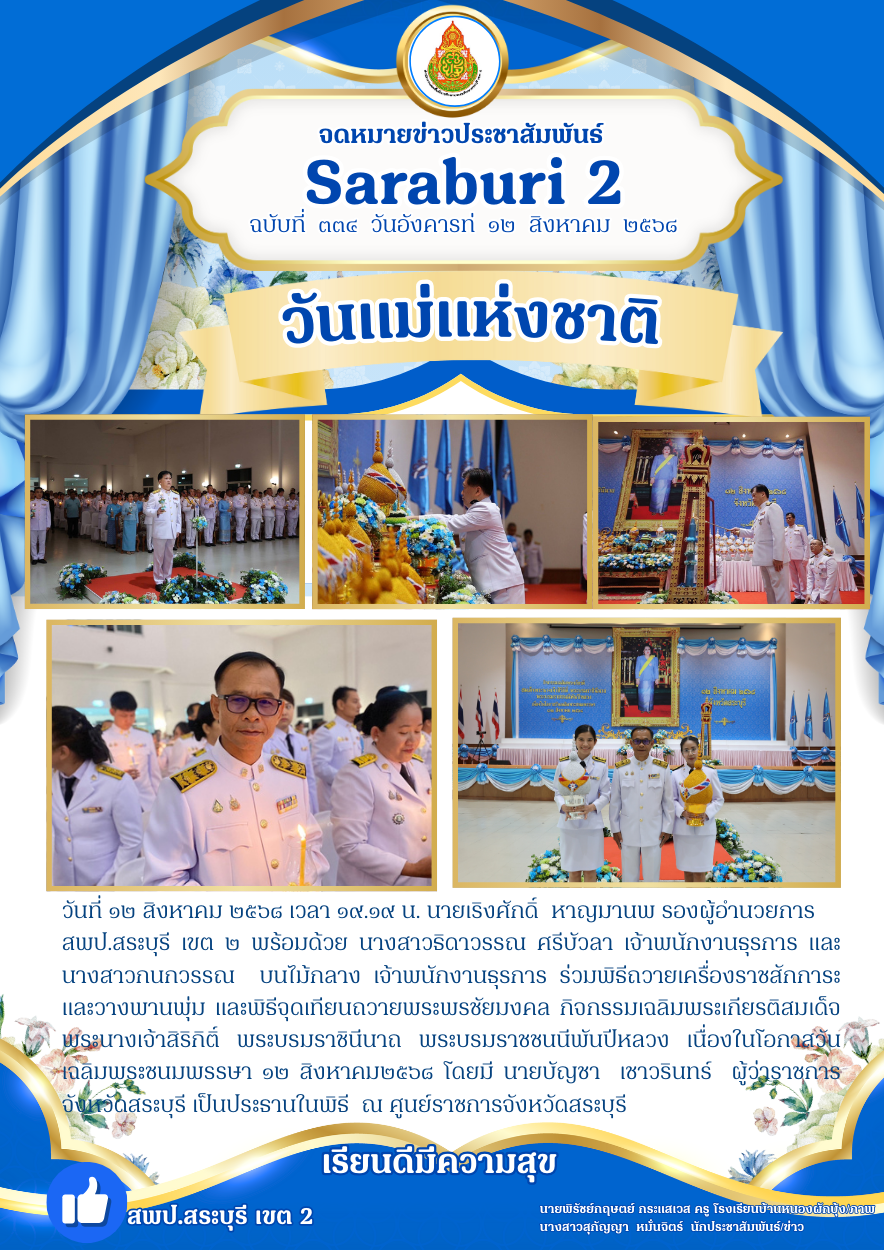 วันที่ ๑๒ สิงหาคม ๒๕๖๘ เวลา ๑๙.๑๙ น. นายเริงศักดิ์ หาญมานพ รองผู้อำนวยการ สพป.สระบุรี เขต ๒ พร้อมด้วย นางสาวธิดาวรรณ ศรีบัวลา เจ้าพนักงานธุรการ และ นางสาวกนกวรรณ บนไม้กลาง เจ้าพนักงานธุรการ ร่วมพิธีถวายเครื่องราชสักการะและวางพานพุ่ม และพิธีจุดเทียนถวายพระพรชัยมงคล กิจกรรมเฉลิมพระเกียรติสมเด็จพระนางเจ้าสิริกิติ์ พระบรมราชินีนาถ พระบรมราชชนนีพันปีหลวง เนื่องในโอกาสวันเฉลิมพระชนมพรรษา ๑๒ สิงหาคม๒๕๖๘ โดยมี นายบัญชา เชาวรินทร์ ผู้ว่าราชการจังหวัดสระบุรี เป็นประธานในพิธี ณ ศูนย์ราชการจังหวัดสระบุรี