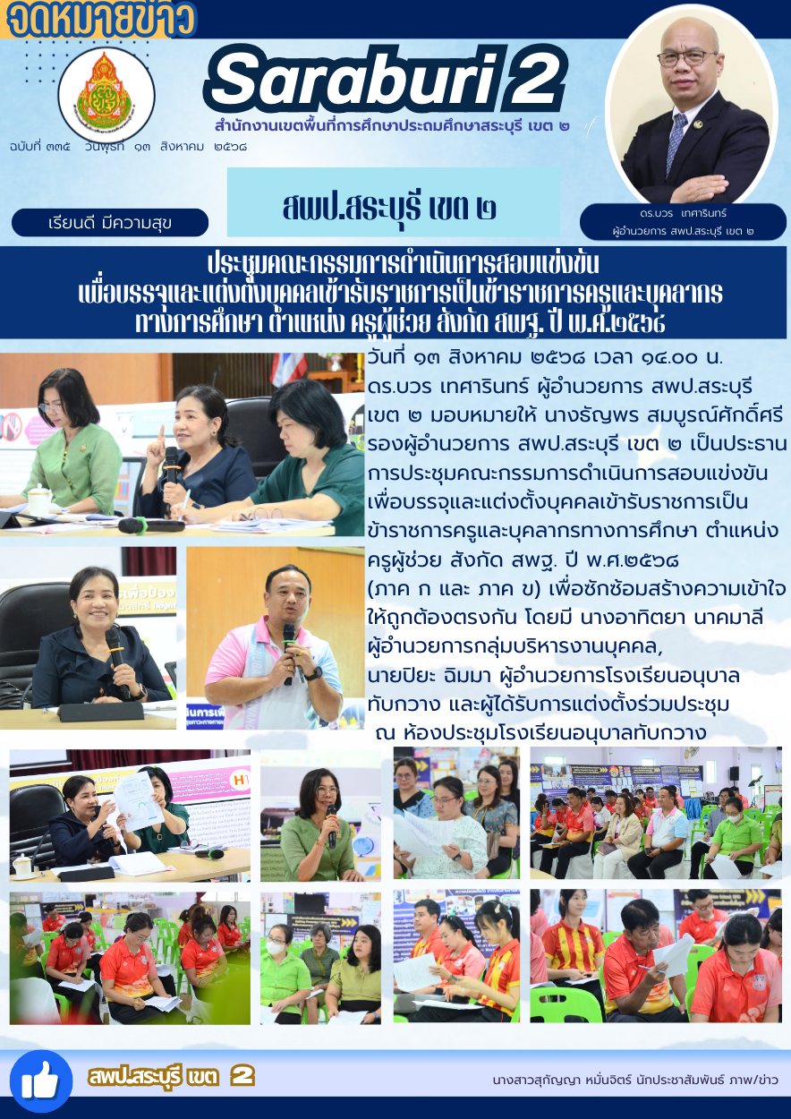 วันที่ ๑๓ สิงหาคม ๒๕๖๘ เวลา ๑๔.๐๐ น. ดร.บวร เทศารินทร์ ผู้อำนวยการ สพป.สระบุรี เขต ๒ มอบหมายให้ นางธัญพร สมบูรณ์ศักดิ์ศรี รองผู้อำนวยการ สพป.สระบุรี เขต ๒ เป็นประธานการประชุมคณะกรรมการดำเนินการสอบแข่งขันเพื่อบรรจุและแต่งตั้งบุคคลเข้ารับราชการเป็นข้าราชการครูและบุคลากรทางการศึกษา ตำแหน่ง ครูผู้ช่วย สังกัด สพฐ. ปี พ.ศ.๒๕๖๘ (ภาค ก และ ภาค ข) เพื่อซักซ้อมสร้างความเข้าใจให้ถูกต้องตรงกัน โดยมี นางอาทิตยา นาคมาลี ผู้อำนวยการกลุ่มบริหารงานบุคคล, นายปิยะ ฉิมมา ผู้อำนวยการโรงเรียนอนุบาลทับกวาง และผู้ได้รับการแต่งตั้งร่วมประชุม ณ ห้องประชุมโรงเรียนอนุบาลทับกวาง