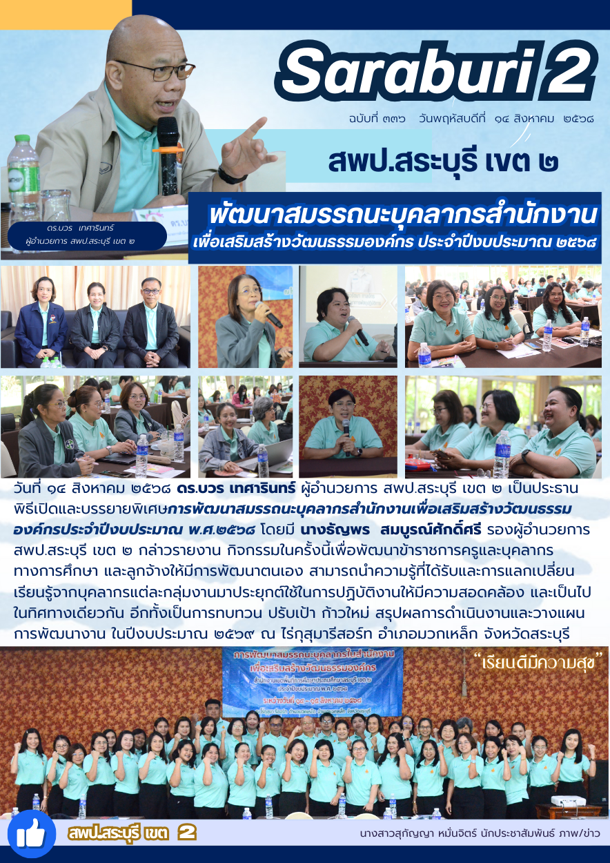 วันที่ ๑๔ สิงหาคม ๒๕๖๘ ดร.บวร เทศารินทร์ ผู้อำนวยการ สพป.สระบุรี เขต ๒ เป็นประธานพิธีเปิดและบรรยายพิเศษการพัฒนาสมรรถนะบุคลากรสำนักงานเพื่อเสริมสร้างวัฒนธรรมองค์กรประจำปีงบประมาณ พ.ศ.๒๕๖๘ โดยมี นางธัญพร สมบูรณ์ศักดิ์ศรี รองผู้อำนวยการ สพป.สระบุรี เขต ๒ กล่าวรายงาน กิจกรรมในครั้งนี้เพื่อพัฒนาข้าราชการครูและบุคลากรทางการศึกษา และลูกจ้างให้มีการพัฒนาตนเอง สามารถนำความรู้ที่ได้รับและการแลกเปลี่ยนเรียนรู้จากบุคลากรแต่ละกลุ่มงานมาประยุกต์ใช้ในการปฏิบัติงานให้มีความสอดคล้อง และเป็นไปในทิศทางเดียวกัน อีกทั้งเป็นการทบทวน ปรับเป้า ก้าวใหม่ สรุปผลการดำเนินงานประจำปีงบประมาณ ๒๕๖๘ และวางแผนการพัฒนางานในปีงบประมาณ ๒๕๖๙ การนี้ นางสาวกัญณัฏฐ์ ทับเกตุ และ นายเริงศักดิ์ หาญมานพ รองผู้อำนวยการ สพป.สระบุรี เขต ๒ และบุคลากรสำนักงานรวม จำนวน ๕๑ คน เข้ารวมกิจกรรม ณ ไร่กุสุมารีสอร์ท อำเภอมวกเหล็ก จังหวัดสระบุรี