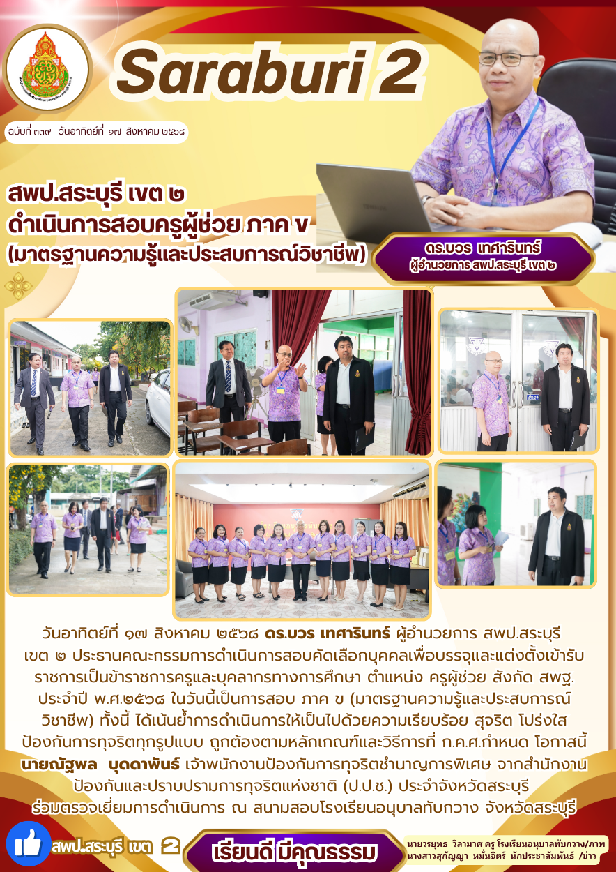 วันอาทิตย์ที่ ๑๗ สิงหาคม ๒๕๖๘ ดร.บวร เทศารินทร์ ผู้อำนวยการ สพป.สระบุรี เขต ๒ ประธานคณะกรรมการดำเนินการสอบคัดเลือกบุคคลเพื่อบรรจุและแต่งตั้งเข้ารับราชการเป็นข้าราชการครูและบุคลากรทางการศึกษา ตำแหน่ง ครูผู้ช่วย สังกัด สพฐ. ประจำปี พ.ศ.๒๕๖๘ ในวันนี้เป็นการสอบ ภาค ข (มาตรฐานความรู้และประสบการณ์วิชาชีพ) ทั้งนี้ ได้เน้นย้ำการดำเนินการให้เป็นไปด้วยความเรียบร้อย สุจริต โปร่งใส ป้องกันการทุจริตทุกรูปแบบ ถูกต้องตามหลักเกณฑ์และวิธีการที่ ก.ค.ศ.กำหนด โอกาสนี้ นายณัฐพล บุดดาพันธ์ เจ้าพนักงานป้องกันการทุจริตชำนาญการพิเศษ จากสำนักงานป้องกันและปราบปรามการทุจริตแห่งชาติ (ป.ป.ช.) ประจำจังหวัดสระบุรี ร่วมตรวจเยี่ยมการดำเนินการ โดยมี นางธัญพร สมบูรณ์ศักดิ์ศรี และ นางสาวกัญณัฏฐ์ ทับเกตุ รองผู้อำนวยการ สพป.สระบุรี เขต ๒ , นางอาทิตยา นาคมาลี ผู้อำนวยการกลุ่มบริหารงานบุคคล ร่วมให้การต้อนรับ ณ สนามสอบโรงเรียนอนุบาลทับกวาง จังหวัดสระบุรี
