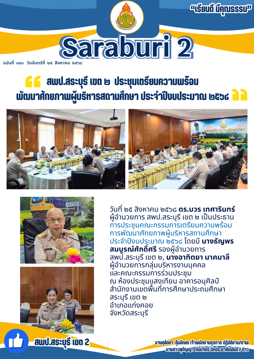 วันที่ ๒๕ สิงหาคม ๒๕๖๘ ดร.บวร เทศารินทร์ ผู้อำนวยการ สพป.สระบุรี เขต ๒ เป็นประธานการประชุมคณะกรรมการเตรียมความพร้อมการพัฒนาศักยภาพผู้บริหารสถานศึกษา ประจำปีงบประมาณ ๒๕๖๘ โดยมี นางธัญพร สมบูรณ์ศักดิ์ศรี รองผู้อำนวยการ สพป.สระบุรี เขต ๒, นางอาทิตยา นาคมาลี ผู้อำนวยการกลุ่มบริหารงานบุคคล และคณะกรรมการร่วมประชุม ณ ห้องประชุมแสงเทียน อาคารอนุศิลป์ สำนักงานเขตพื้นที่การศึกษาประถมศึกษาสระบุรี เขต ๒ อำเภอแก่งคอย จังหวัดสระบุรี