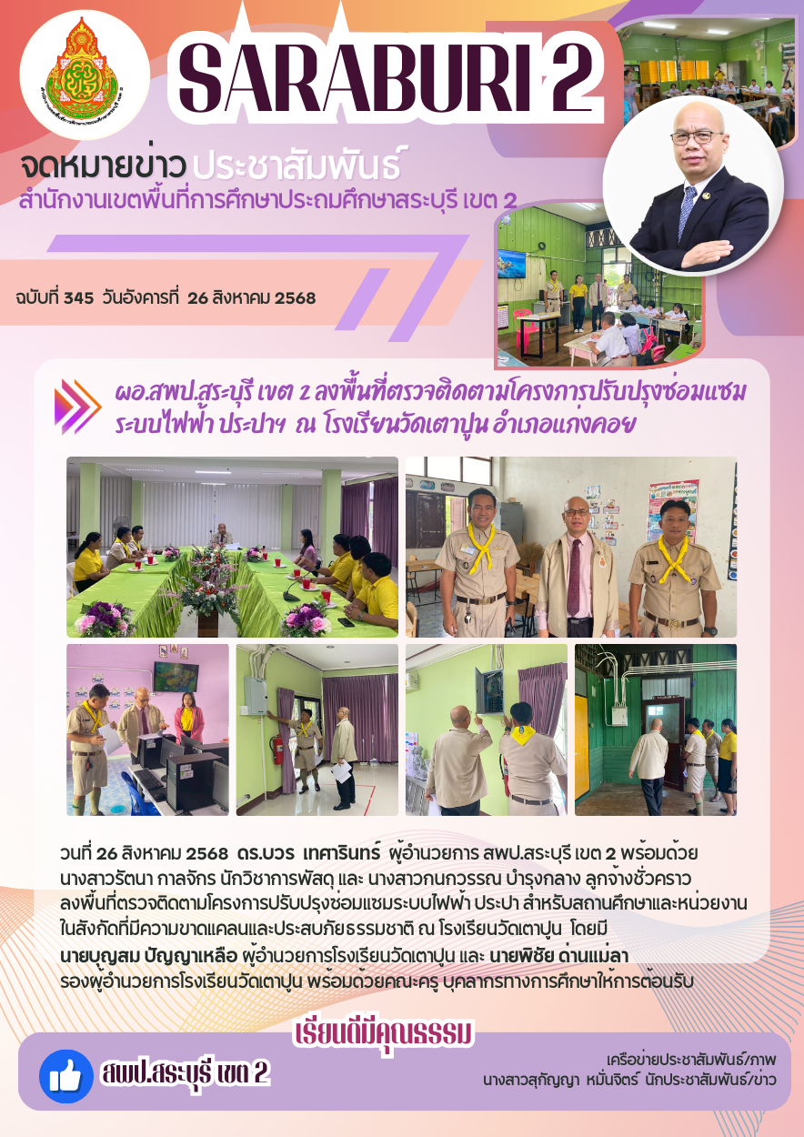 วันที่ ๒๖ สิงหาคม 2568 ดร.บวร เทศารินทร์ ผู้อำนวยการ สพป.สระบุรี เขต 2 พร้อมด้วย นางสาวรัตนา กาลจักร นักวิชาการพัสดุ และ นางสาวกนกวรรณ บำรุงกลาง ลูกจ้างชั่วคราวลงพื้นที่ตรวจติดตามโครงการปรับปรุงซ่อมแซมระบบไฟฟ้า ประปา สำหรับสถานศึกษาและหน่วยงานในสังกัดที่มีความขาดแคลนและประสบภัยธรรมชาติ ณ โรงเรียนวัดเตาปูน โดยมี นายบุญสม ปัญญาเหลือ ผู้อำนวยการโรงเรียนวัดเตาปูน และ นายพิชัย ด่านแม่ลา รองผู้อำนวยการโรงเรียนวัดเตาปูน พร้อมด้วยคณะครู บุคลากรทางการศึกษาให้การต้อนรับ