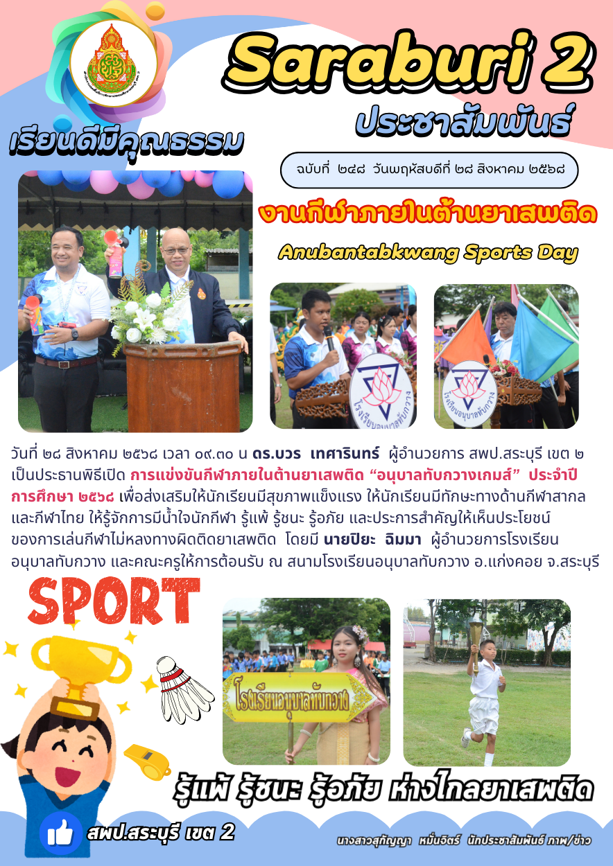 วันที่ ๒๘ สิงหาคม ๒๕๖๘ เวลา ๐๙.๓๐ น ดร.บวร เทศารินทร์ ผู้อำนวยการ สพป.สระบุรี เขต ๒ เป็นประธานพิธีเปิด การแข่งขันกีฬาภายในต้านยาเสพติด “อนุบาลทับกวางเกมส์” ประจำปีการศึกษา ๒๕๖๘ เพื่อส่งเสริมให้นักเรียนมีสุขภาพแข็งแรง ให้นักเรียนมีทักษะทางด้านกีฬาสากลและกีฬาไทย ให้รู้จักการมีน้ำใจนักกีฬา รู้แพ้ รู้ชนะ รู้อภัย และประการสำคัญให้เห็นประโยชน์ของการเล่นกีฬาไม่หลงทางผิดติดยาเสพติด โดยมี นายปิยะ ฉิมมา ผู้อำนวยการโรงเรียนอนุบาลทับกวาง และคณะครูให้การต้อนรับ ณ สนามโรงเรียนอนุบาลทับกวาง อ.แก่งคอย จ.สระบุรี
