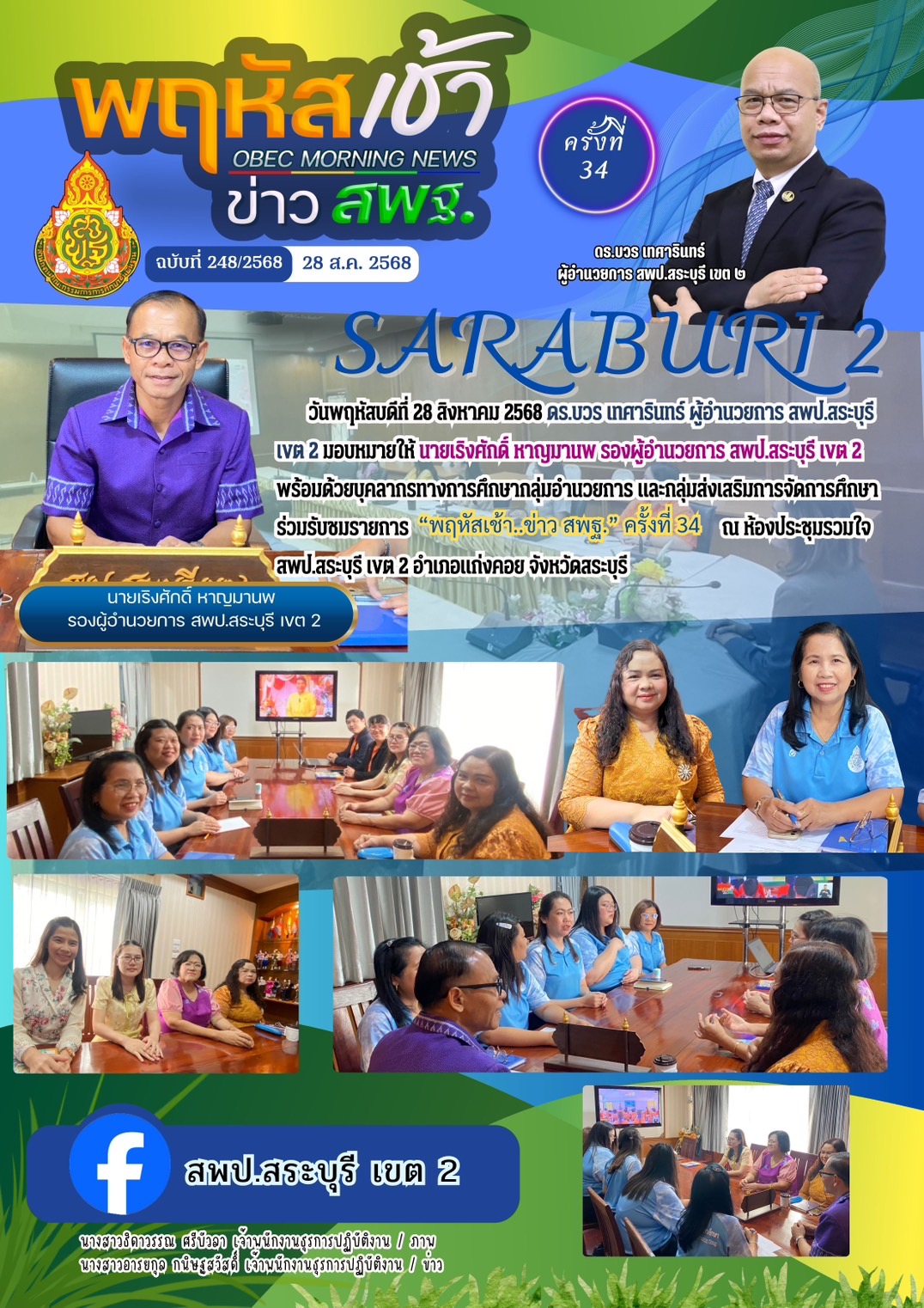 วันที่ ๒๘ สิงหาคม ๒๕๖๘ ดร.บวร เทศารินทร์ ผู้อำนวยการ สพป.สระบุรี เขต ๒ มอบหมายให้ นายเริงศักดิ์ หาญมานพ รองผู้อำนวยการ สพป.สระบุรี เขต ๒ พร้อมด้วย นางมาลี แก้วแววนาม ผู้อำนวยการกลุ่มอำนวยการ , นางกชพร ศิริปรุ ผู้อำนวยการกลุ่มส่งเสริมการจัดการศึกษาและบุคลากรทางการศึกษาทั้งสองกลุ่ม ร่วมรับชมรายการ "พฤหัสเช้า..ข่าว สพฐ." ครั้งที่ ๓๔/๒๕๖๘ ณ ห้องประชุมรวมใจ สพป.สระบุรี เขต ๒ อำเภอแก่งคอย จังหวัดสระบุรี