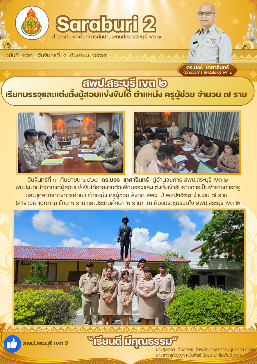 วันจันทร์ที่ ๑ กันยายน ๒๕๖๘ ดร.บวร เทศารินทร์ ผู้อำนวยการ สพป.สระบุรี เขต ๒ พบปะมอบโอวาทแก่ผู้สอบแข่งขันได้รายงานตัวเพื่อบรรจุและแต่งตั้งเข้ารับราชการเป็นข้าราชการครูและบุคลากรทางการศึกษา ตำแหน่ง ครูผู้ช่วย สังกัด สพฐ. ปี พ.ศ.๒๕๖๘ จำนวน ๗ ราย (สาขาวิชาเอกภาษาไทย ๑ ราย และประถมศึกษา ๖ ราย) ณ ห้องประชุมรวมใจ สพป.สระบุรี เขต ๒ อำเภอแก่งคอย จังหวัดสระบุรี