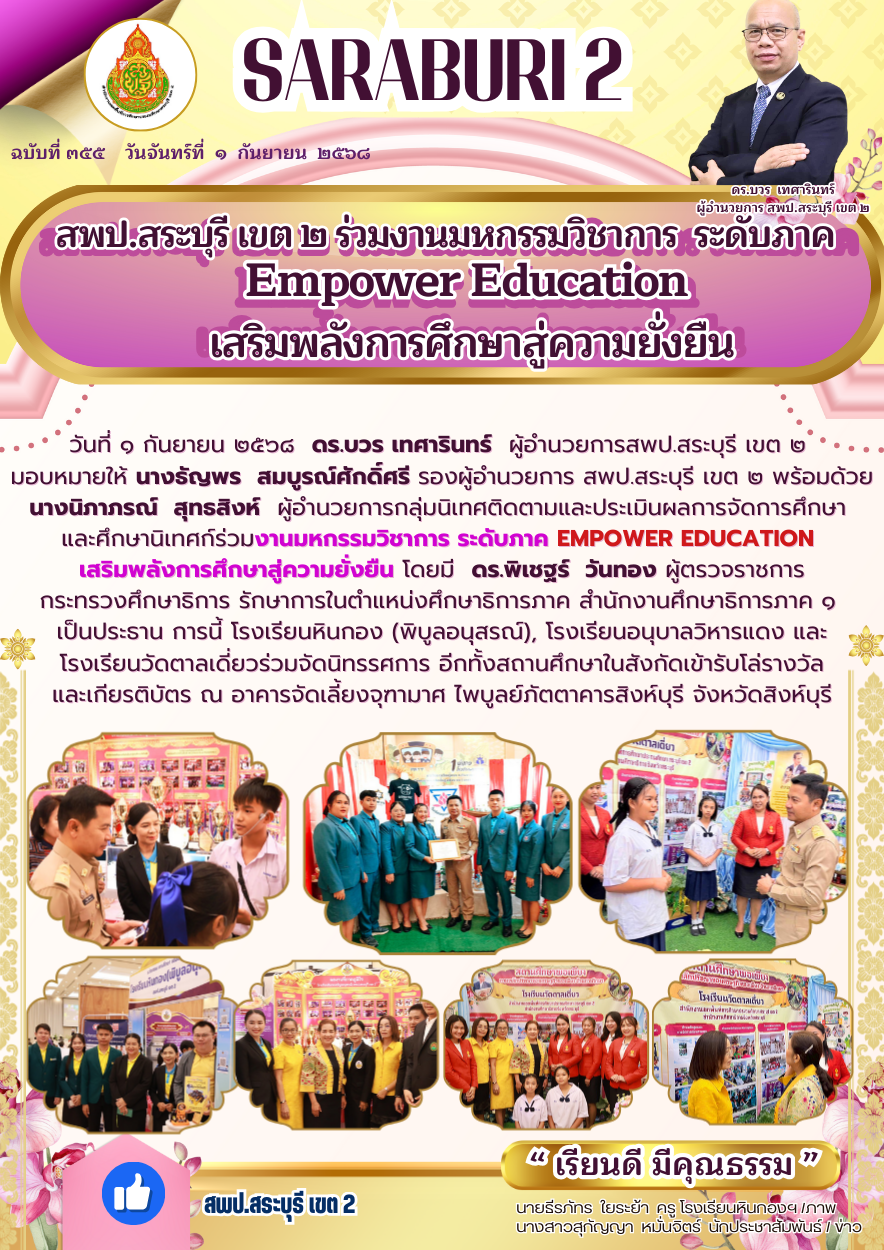 วันที่ ๑ กันยายน ๒๕๖๘ ดร.บวร เทศารินทร์ ผู้อำนวยการสพป.สระบุรี เขต ๒ มอบหมายให้ นางธัญพร สมบูรณ์ศักดิ์ศรี รองผู้อำนวยการ สพป.สระบุรี เขต ๒ พร้อมด้วย นางนิภาภรณ์ สุทธสิงห์ ผู้อำนวยการกลุ่มนิเทศติดตามและประเมินผลการจัดการศึกษา และศึกษานิเทศก์ร่วมงานมหกรรมวิชาการ ระดับภาค Empower Education เสริมพลังการศึกษาสู่ความยั่งยืน โดยมี ดร.พิเชฐร์ วันทอง ผู้ตรวจราชการกระทรวงศึกษาธิการ รักษาการในตำแหน่งศึกษาธิการภาค สำนักงานศึกษาธิการภาค ๑ เป็นประธาน การนี้ โรงเรียนหินกอง (พิบูลอนุสรณ์), โรงเรียนอนุบาลวิหารแดง และ โรงเรียนวัดตาลเดี่ยวร่วมจัดนิทรรศการ อีกทั้งสถานศึกษาในสังกัดเข้ารับโล่รางวัลและเกียรติบัตร ณ อาคารจัดเลี้ยงจุฑามาศ ไพบูลย์ภัตตาคารสิงห์บุรี อำเภอเมืองสิงห์บุรี จังหวัดสิงห์บุรี