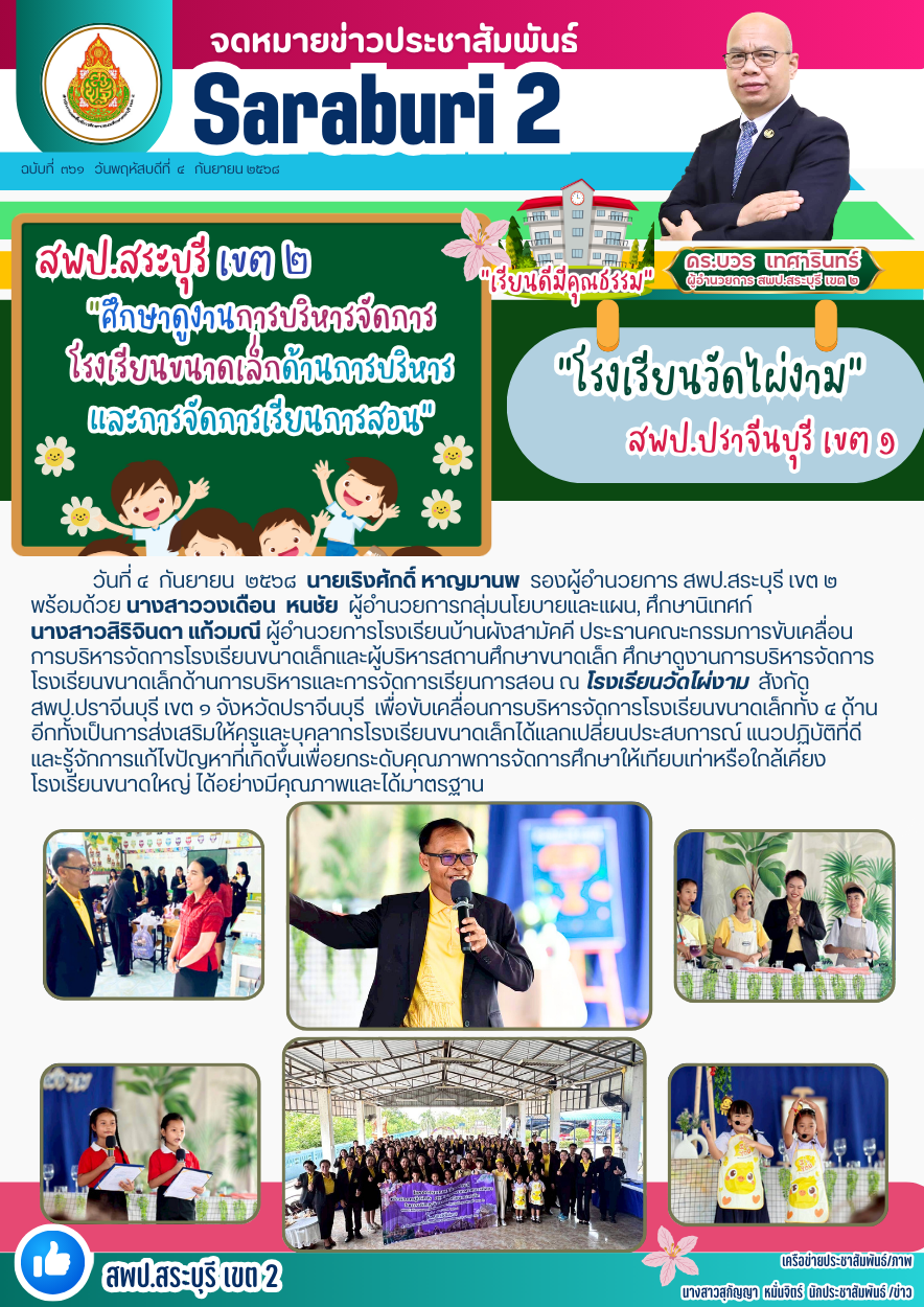วันที่ ๔ กันยายน ๒๕๖๘ นายเริงศักดิ์ หาญมานพ รองผู้อำนวยการ สพป.สระบุรี เขต ๒ พร้อมด้วย นางสาววงเดือน หนชัย ผู้อำนวยการกลุ่มนโยบายและแผน, ศึกษานิเทศก์ นางสาวสิริจินดา แก้วมณี ผู้อำนวยการโรงเรียนบ้านผังสามัคคี ประธานคณะกรรมการขับเคลื่อนการบริหารจัดการโรงเรียนขนาดเล็กและผู้บริหารสถานศึกษาขนาดเล็ก ศึกษาดูงานการบริหารจัดการโรงเรียนขนาดเล็กด้านการบริหารและการจัดการเรียนการสอน ณ โรงเรียนวัดไผ่งาม สังกัด สพป.ปราจีนบุรี เขต ๑ จังหวัดปราจีนบุรี เพื่อขับเคลื่อนการบริหารจัดการโรงเรียนขนาดเล็กทั้ง ๔ ด้าน อีกทั้งเป็นการส่งเสริมให้ครูและบุคลากรโรงเรียนขนาดเล็กได้แลกเปลี่ยนประสบการณ์ แนวปฏิบัติที่ดีและรู้จักการแก้ไขปัญหาที่เกิดขึ้นเพื่อยกระดับคุณภาพการจัดการศึกษาให้เทียบเท่าหรือใกล้เคียงโรงเรียนขนาดใหญ่ ได้อย่างมีคุณภาพและได้มาตรฐาน