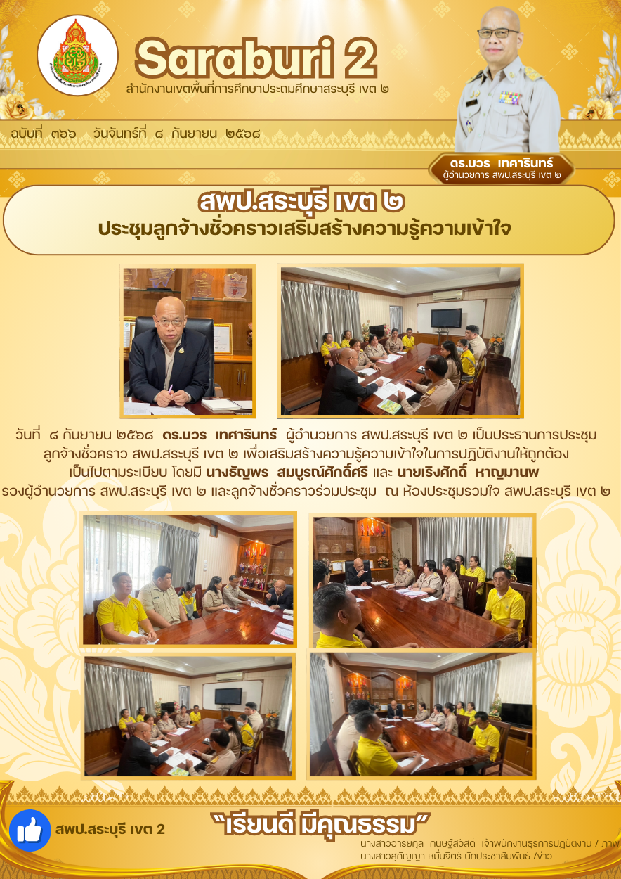 วันที่ ๘ กันยายน ๒๕๖๘ ดร.บวร เทศารินทร์ ผู้อำนวยการ สพป.สระบุรี เขต ๒ เป็นประธานการประชุมลูกจ้างชั่วคราว สพป.สระบุรี เขต ๒ เพื่อเสริมสร้างความรู้ความเข้าใจในการปฏิบัติงานให้ถูกต้องเป็นไปตามระเบียบ โดยมี นางธัญพร สมบูรณ์ศักดิ์ศรี และ นายเริงศักดิ์ หาญมานพ รองผู้อำนวยการ สพป.สระบุรี เขต ๒ และลูกจ้างชั่วคราวร่วมประชุม ณ ห้องประชุมรวมใจ สพป.สระบุรี เขต ๒