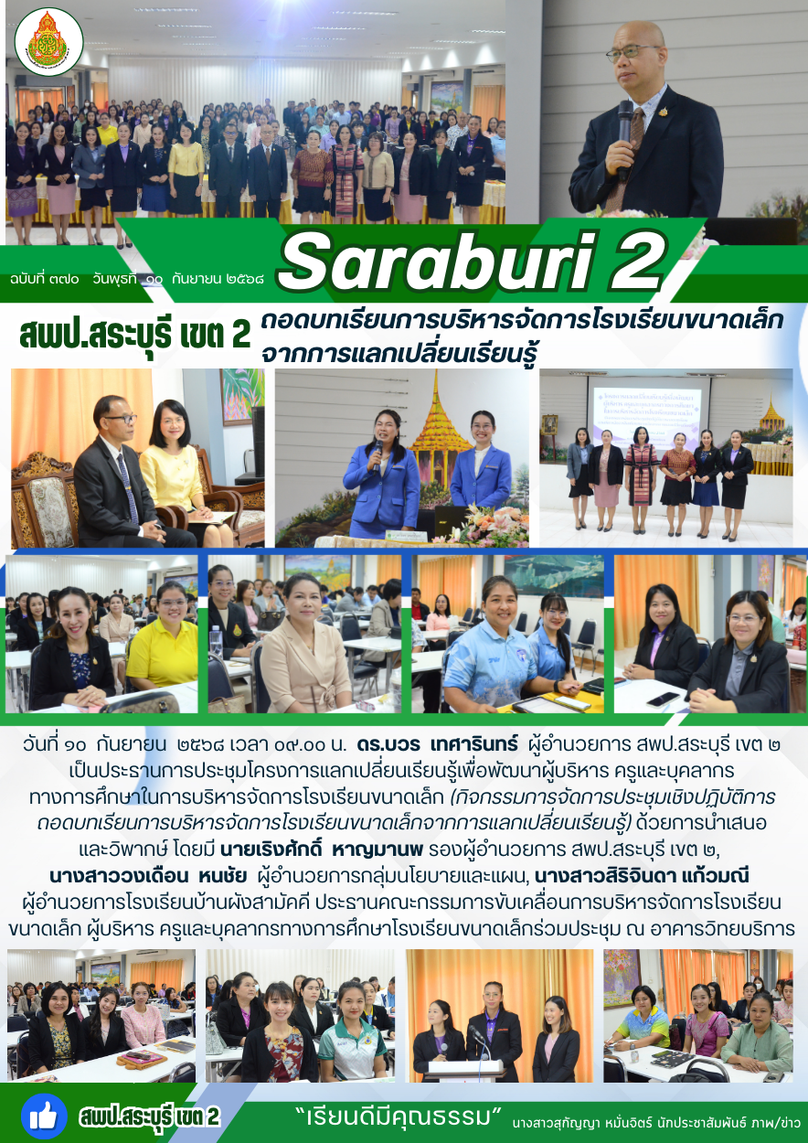 วันที่ ๑๐ กันยายน ๒๕๖๘ เวลา ๐๙.๐๐ น. ดร.บวร เทศารินทร์ ผู้อำนวยการ สพป.สระบุรี เขต ๒เป็นประธานการประชุมโครงการแลกเปลี่ยนเรียนรู้เพื่อพัฒนาผู้บริหาร ครูและบุคลากรทางการศึกษาในการบริหารจัดการโรงเรียนขนาดเล็ก (กิจกรรมการจัดการประชุมเชิงปฏิบัติการถอดบทเรียนการบริหารจัดการโรงเรียนขนาดเล็กจากการแลกเปลี่ยนเรียนรู้) ด้วยการนำเสนอและวิพากษ์ โดยมี นายเริงศักดิ์ หาญมานพ รองผู้อำนวยการ สพป.สระบุรี เขต ๒, นางสาววงเดือน หนชัย ผู้อำนวยการกลุ่มนโยบายและแผน, นางสาวสิริจินดา แก้วมณี ผู้อำนวยการโรงเรียนบ้านผังสามัคคี ประธานคณะกรรมการขับเคลื่อนการบริหารจัดการโรงเรียนขนาดเล็ก ผู้บริหาร ครูและบุคลากรทางการศึกษาโรงเรียนขนาดเล็กร่วมประชุม ณ อาคารวิทยบริการ สพป.สระบุรี เขต ๒ อำเภอแก่งคอย จังหวัดสระบุรี