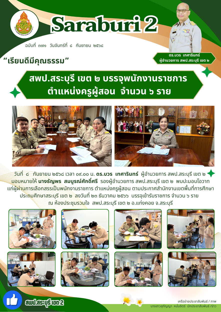 วันที่ ๘ กันยายน ๒๕๖๘ เวลา ๐๙.๐๐ น. ดร.บวร เทศารินทร์ ผู้อำนวยการ สพป.สระบุรี เขต ๒ มอบหมายให้ นางธัญพร สมบูรณ์ศักดิ์ศรี รองผู้อำนวยการ สพป.สระบุรี เขต ๒ พบปะมอบโอวาทแก่ผู้ผ่านการเลือกสรรเป็นพนักงานราชการ ตำแหน่งครูผู้สอน ตามประกาศสำนักงานเขตพื้นที่การศึกษาประถมศึกษาสระบุรี เขต ๒ ลงวันที่ ๒๓ ธันวาคม ๒๕๖๖ บรรจุเข้ารับราชการ จำนวน ๖ ราย