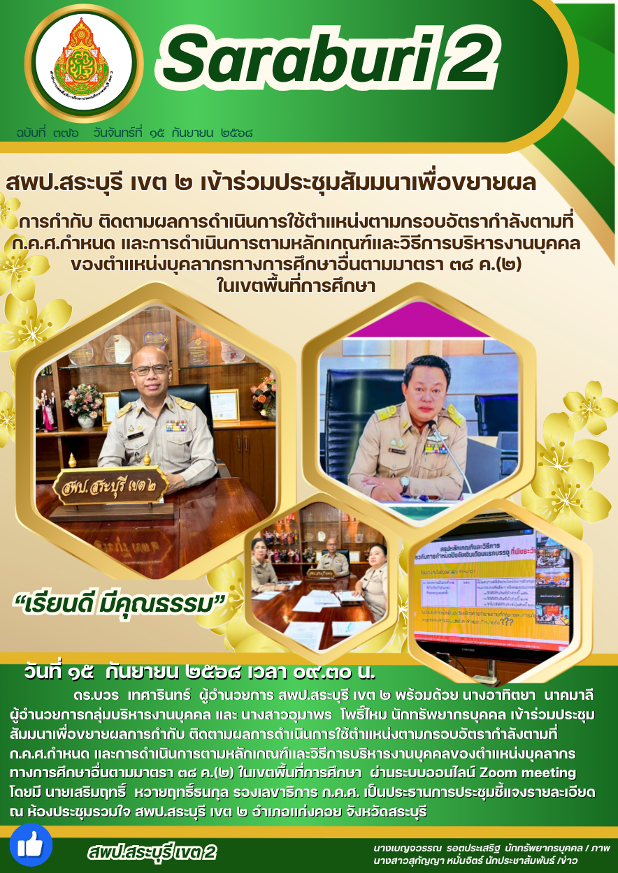 วันจันทร์ที่ ๑๕ กันยายน ๒๕๖๘ เวลา ๐๙.๓๐ น. ดร.บวร เทศารินทร์ ผู้อำนวยการ สพป.สระบุรี เขต ๒ พร้อมด้วย นางอาทิตยา นาคมาลี ผู้อำนวยการกลุ่มบริหารงานบุคคล และ นางสาวอุมาพร โพธิ์ไหม นักทรัพยากรบุคคล เข้าร่วมประชุมสัมมนาเพื่อขยายผลการกำกับ ติดตามผลการดำเนินการใช้ตำแหน่งตามกรอบอัตรากำลังตามที่ ก.ค.ศ.กำหนด และการดำเนินการตามหลักเกณฑ์และวิธีการบริหารงานบุคคลของตำแหน่งบุคลากร
