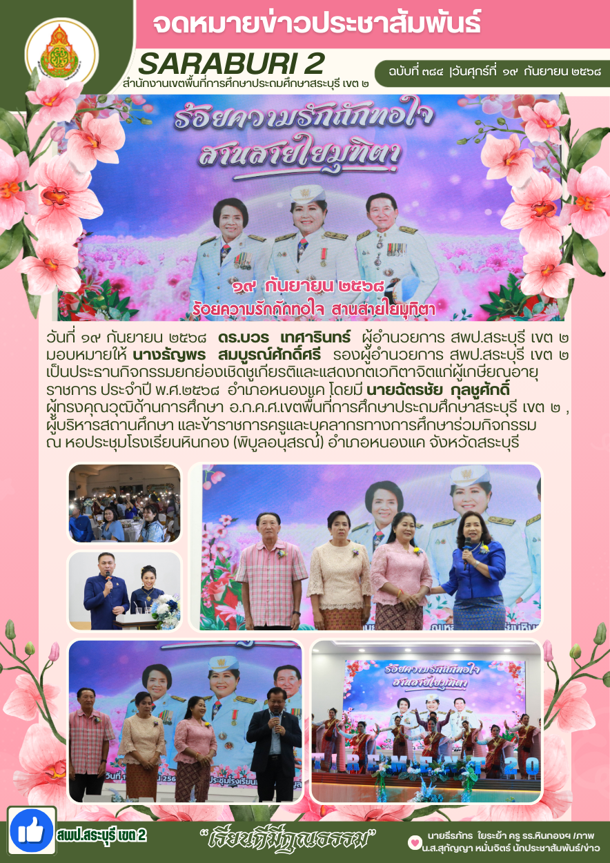 วันที่ ๑๙ กันยายน ๒๕๖๘ ดร.บวร เทศารินทร์ ผู้อำนวยการ สพป.สระบุรี เขต ๒ มอบหมายให้ นางธัญพร สมบูรณ์ศักดิ์ศรี รองผู้อำนวยการ สพป.สระบุรี เขต ๒ เป็นประธานกิจกรรมยกย่องเชิดชูเกียรติและแสดงกตเวทิตาจิตแก่ผู้เกษียณอายุราชการ ประจำปี พ.ศ.๒๕๖๘ อำเภอหนองแค โดยมี นายฉัตรชัย กุลชูศักดิ์ ผู้ทรงคุณวุฒิด้านการศึกษา อ.ก.ค.ศ.เขตพื้นที่การศึกษาประถมศึกษาสระบุรี เขต ๒ , ผู้บริหารสถานศึกษา และข้าราชการครูและบุคลากรทางการศึกษาร่วมกิจกรรม ณ หอประชุมโรงเรียนหินกอง (พิบูลอนุสรณ์) อำเภอหนองแค จังหวัดสระบุรี