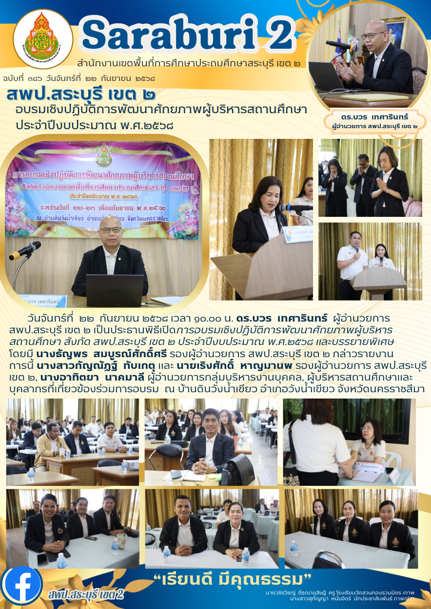 วันจันทร์ที่ ๒๒ กันยายน ๒๕๖๘ เวลา ๑๐.๐๐ น. ดร.บวร เทศารินทร์ ผู้อำนวยการ สพป.สระบุรี เขต ๒ เป็นประธานพิธีเปิดการอบรมเชิงปฏิบัติการพัฒนาศักยภาพผู้บริหารสถานศึกษา สังกัด สพป.สระบุรี เขต ๒ ประจำปีงบประมาณ พ.ศ.๒๕๖๘ และบรรยายพิเศษโดยมี นางธัญพร สมบูรณ์ศักดิ์ศรี รองผู้อำนวยการ สพป.สระบุรี เขต ๒ กล่าวรายงานการนี้ นางสาวกัญณัฏฐ์ ทับเกตุ และ นายเริงศักดิ์ หาญมานพ รองผู้อำนวยการ สพป.สระบุรี เขต ๒, นางอาทิตยา นาคมาลี ผู้อำนวยการกลุ่มบริหารงานบุคคล, ผู้บริหารสถานศึกษาและบุคลากรที่เกี่ยวข้องร่วมการอบรม อบรมระหว่างวันที่ ๒๒ - ๒๓ กันยายน ๒๕๖๘ ณ บ้านดินวังน้ำเขียว อำเภอวังน้ำเขียว จังหวัดนครราชสีมา