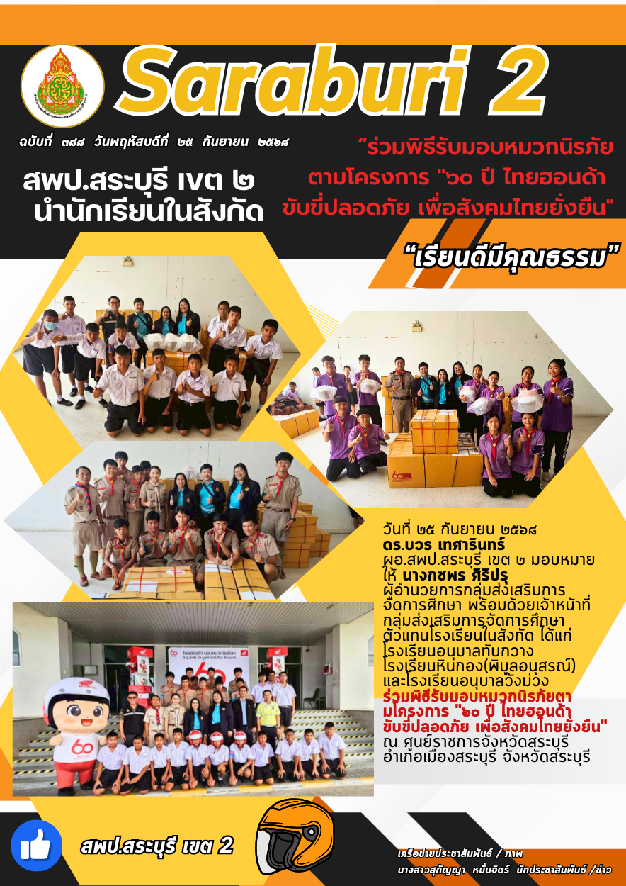 สพป.สระบุรี เขต ๒ นำนักเรียนรับมอบหมวกนิรภัยตามโครงการ "๖๐ ปี ไทยฮอนด้าขับขี่ปลอดภัย เพื่อสังคมไทยยั่งยืน"