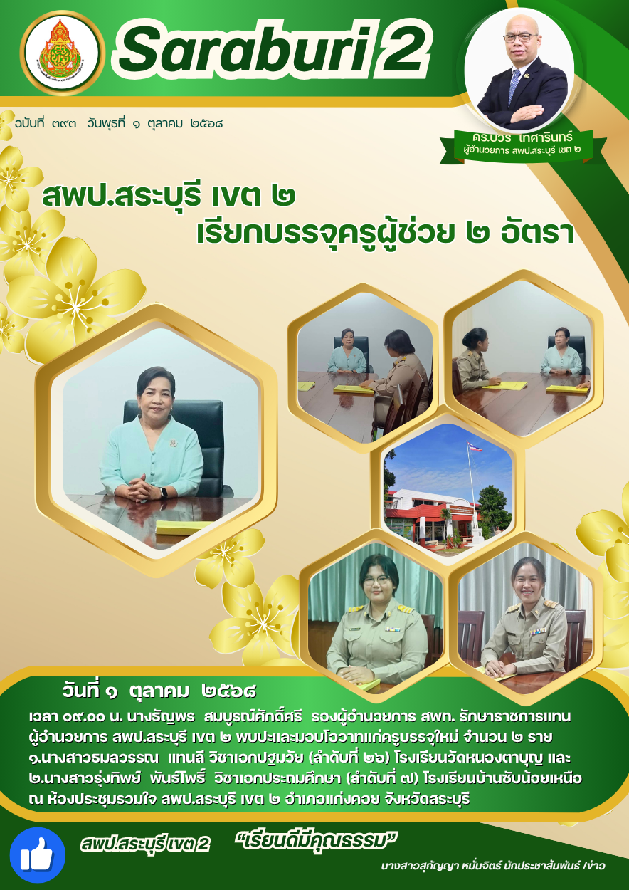 วลา ๐๙.๐๐ น. นางธัญพร สมบูรณ์ศักดิ์ศรี รองผู้อำนวยการ สพท. รักษาราชการแทนผู้อำนวยการ สพป.สระบุรี เขต ๒ พบปะและมอบโอวาทแก่ครูบรรจุใหม่ จำนวน ๒ ราย ๑.นางสาวธมลวรรณ แทนลี วิชาเอกปฐมวัย (ลำดับที่ ๒๖) โรงเรียนวัดหนองตาบุญ และ