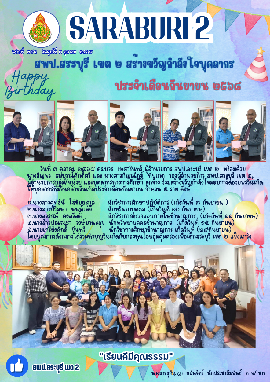 วันที่ ๓ ตุลาคม ๒๕๖๘ ดร.บวร เทศารินทร์ ผู้อำนวยการ สพป.สระบุรี เขต ๒ พร้อมด้วย นางธัญพร สมบูรณ์ศักดิ์ศรี และ นางสาวกัญณัฏฐ์ ทับเกตุ รองผู้อำนวยการ สพป.สระบุรี เขต ๒, ผู้อำนวยการกลุ่ม/หน่วย และบุคลากรทางการศึกษา ลูกจ้าง ร่วมสร้างขวัญกำลังใจมอบการ์ดอวยพรวันเกิดให้บุคลากรที่มีวันคล้ายวันเกิดประจำเดือนกันยายน จำนวน ๕ ราย ดังนี้