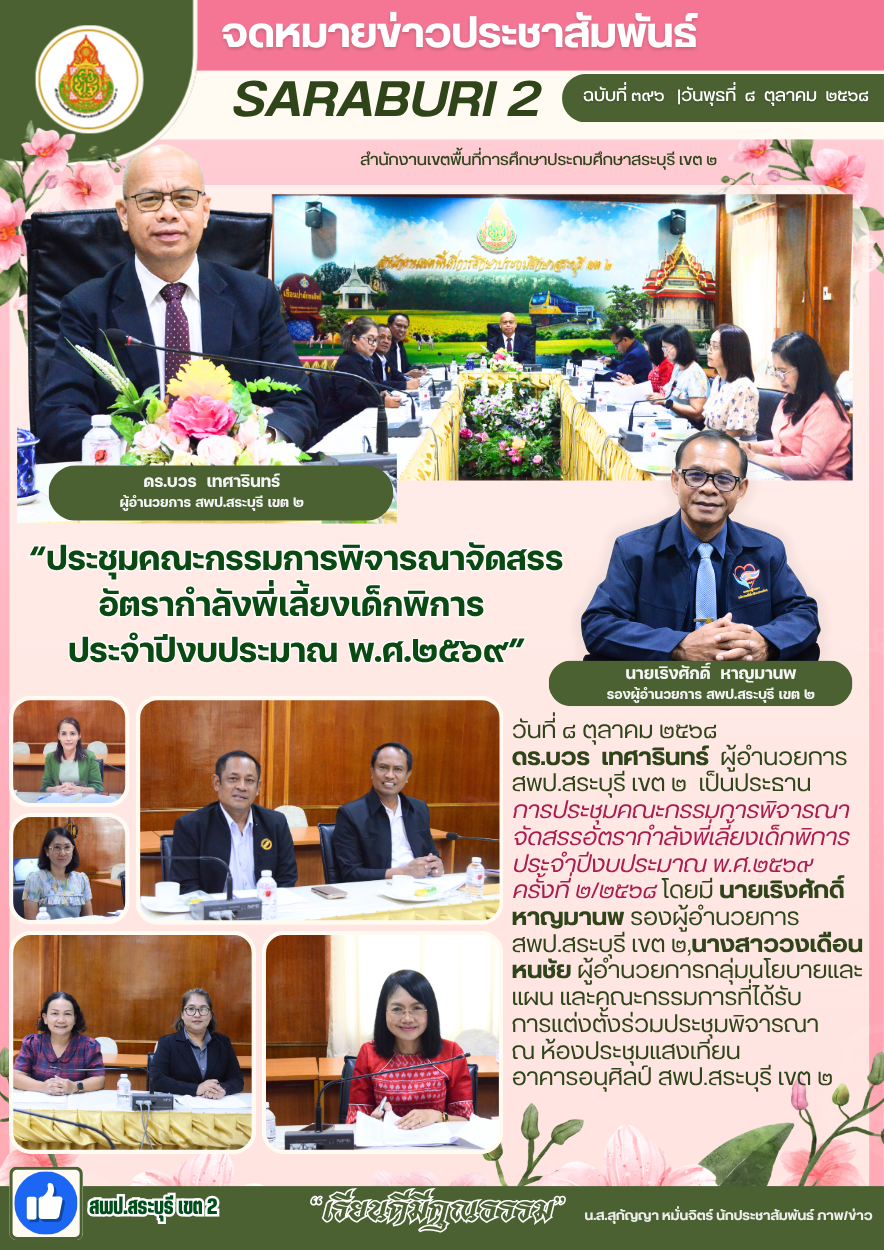 วันที่ ๘ ตุลาคม ๒๕๖๘ เวลา ๐๙.๓๐ น. ดร.บวร เทศารินทร์ ผู้อำนวยการ สพป.สระบุรี เขต ๒ เป็นประธานการประชุมคณะกรรมการพิจารณาจัดสรรอัตรากำลังพี่เลี้ยงเด็กพิการ ประจำปีงบประมาณ พ.ศ.๒๕๖๙ ครั้งที่ ๒/๒๕๖๘ โดยมี นายเริงศักดิ์ หาญมานพ รองผู้อำนวยการ สพป.สระบุรี เขต ๒,นางสาววงเดือน หนชัย ผู้อำนวยการกลุ่มนโยบายและแผน และคณะกรรมการที่ได้รับการแต่งตั้งร่วมประชุมพิจารณา ณ ห้องประชุมแสงเทียน อาคารอนุศิลป์ สพป.สระบุรี เขต ๒ อำเภอแก่งคอย จังหวัดสระบุรี
