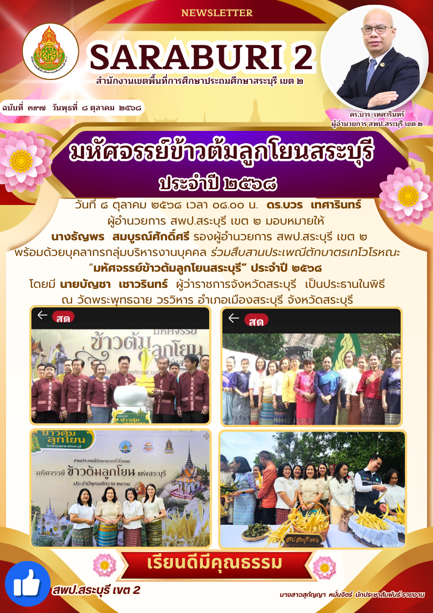 วันที่ ๘ ตุลาคม ๒๕๖๘ เวลา ๐๘.๐๐ น. ดร.บวร เทศารินทร์ ผู้อำนวยการ สพป.สระบุรี เขต ๒ มอบหมายให้ นางธัญพร สมบูรณ์ศักดิ์ศรี รองผู้อำนวยการ สพป.สระบุรี เขต ๒ พร้อมด้วยบุคลากรกลุ่มบริหารงานบุคคล ร่วมสืบสานประเพณีตักบาตรเทโวโรหณะ “มหัศจรรย์ข้าวต้มลูกโยนสระบุรี” ประจำปี ๒๕๖๘ โดยมี นายบัญชา เชาวรินทร์ ผู้ว่าราชการจังหวัดสระบุรี เป็นประธานในพิธี ณ วัดพระพุทธฉาย วรวิหาร อำเภอเมืองสระบุรี จังหวัดสระบุรี