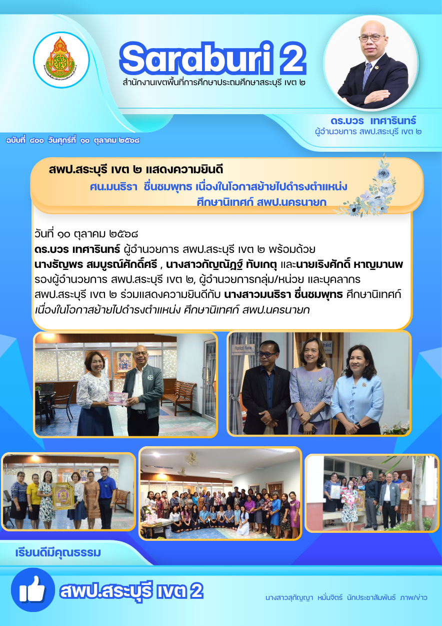 วันที่ ๑๐ ตุลาคม ๒๕๖๘ ดร.บวร เทศารินทร์ ผู้อำนวยการ สพป.สระบุรี เขต ๒ พร้อมด้วย นางธัญพร สมบูรณ์ศักดิ์ศรี , นางสาวกัญณัฏฐ์ ทับเกตุ และนายเริงศักดิ์ หาญมานพ รองผู้อำนวยการ สพป.สระบุรี เขต ๒, ผู้อำนวยการกลุ่ม/หน่วย และบุคลากร สพป.สระบุรี เขต ๒ ร่วมแสดงความยินดีกับ นางสาวมนธิรา ชื่นชมพุทธ ศึกษานิเทศก์ เนื่องในโอกาสย้ายไปดำรงตำแหน่ง ศึกษานิเทศก์ สพป.นครนายก