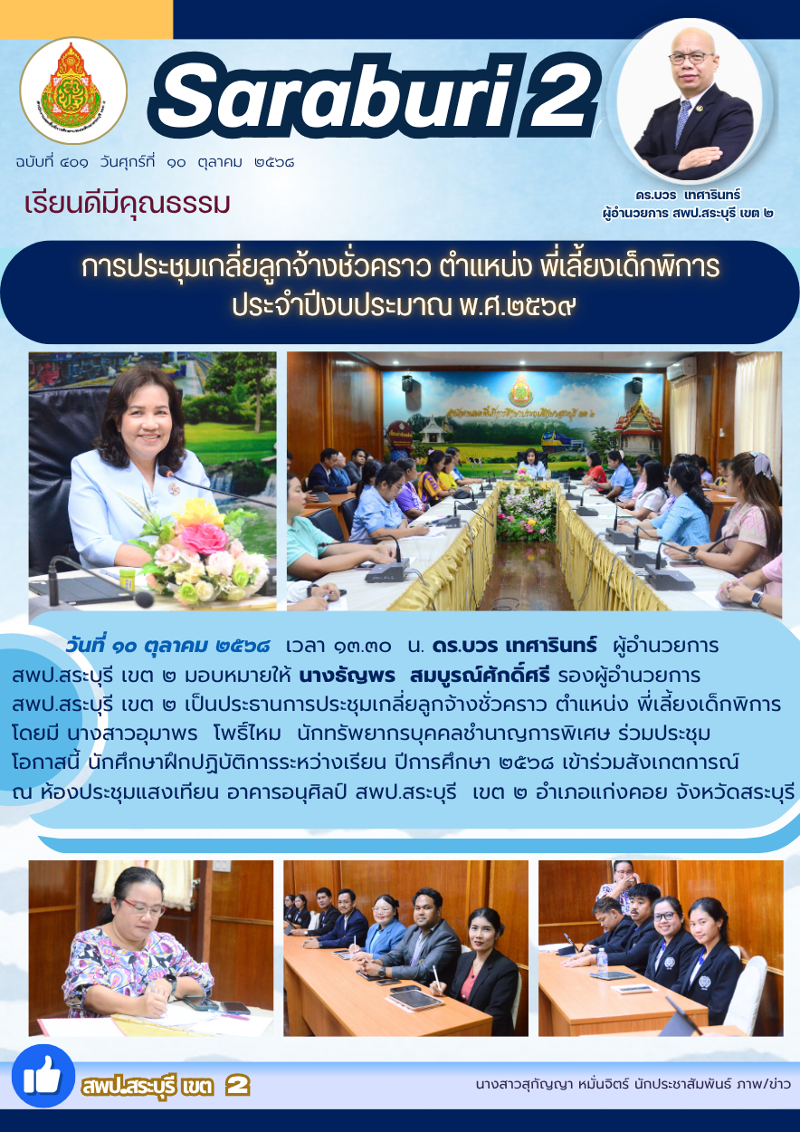 วันที่ ๑๐ ตุลาคม ๒๕๖๘ เวลา ๑๓.๓๐ น. ดร.บวร เทศารินทร์ ผู้อำนวยการ สพป.สระบุรี เขต ๒ มอบหมายให้ นางธัญพร สมบูรณ์ศักดิ์ศรี รองผู้อำนวยการ สพป.สระบุรี เขต ๒ เป็นประธานการประชุมเกลี่ยลูกจ้างชั่วคราว ตำแหน่ง พี่เลี้ยงเด็กพิการโดยมี นางสาวอุมาพร โพธิ์ไหม นักทรัพยากรบุคคลชำนาญการพิเศษ ร่วมประชุมโอกาสนี้ นักศึกษาฝึกปฏิบัติการระหว่างเรียน ปีการศึกษา ๒๕๖๘ เข้าร่วมสังเกตการณ์ ณ ห้องประชุมแสงเทียน อาคารอนุศิลป์ สพป.สระบุรี เขต ๒ อำเภอแก่งคอย จังหวัดสระบุรี
