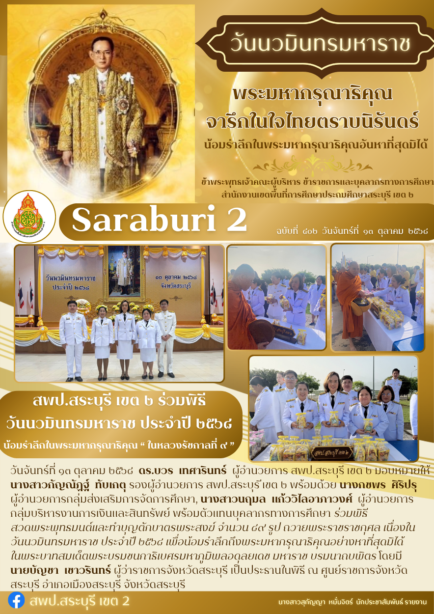 วันจันทร์ที่ ๑๓ ตุลาคม ๒๕๖๘ ดร.บวร เทศารินทร์ ผู้อำนวยการ สพป.สระบุรี เขต ๒ มอบหมายให้ นางสาวกัญณัฏฐ์ ทับเกตุ รองผู้อำนวยการ สพป.สระบุร ีเขต ๒ พร้อมด้วย นางกชพร ศิริปรุ ผู้อำนวยการกลุ่มส่งเสริมการจัดการศึกษา, นางสาวนฤมล แก้ววิไลอาภาวงศ์ ผู้อำนวยการ กลุ่มบริหารงานการเงินและสินทรัพย์ พร้อมตัวแทนบุคลากรทางการศึกษา ร่วมพิธีสวดพระพุทธมนต์และทำบุญตักบาตรพระสงฆ์ จำนวน ๘๙ รูป ถวายพระราชราชกุศล เนื่องในวันนวมินทรมหาราช ประจำปี ๒๕๖๘ เพื่อน้อมรำลึกถึงพระมหากรุณาธิคุณอย่างหาที่สุดมิได้ในพระบาทสมเด็ตพระบรมชนกาธิเบศรมหาภูมิพลอดุลยเดช มหาราช บรมนาถบพิตร โดยมี นายบัญชา เชาวรินทร์ ผู้ว่าราชการจังหวัดสระบุรี เป็นประธานในพิธี ณ ศูนย์ราชการจังหวัดสระบุรี อำเภอเมืองสระบุรี จังหวัดสระบุรี